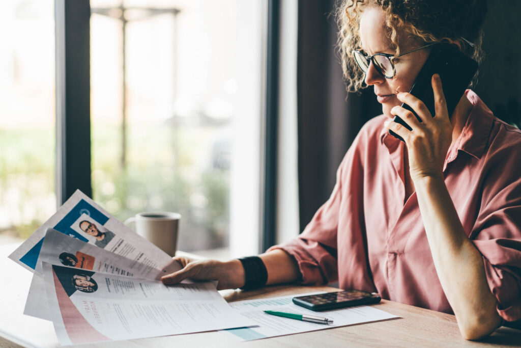 Managerin, die viele verschiedene Lebensläufe durchsieht und die perfekte Person auswählt.